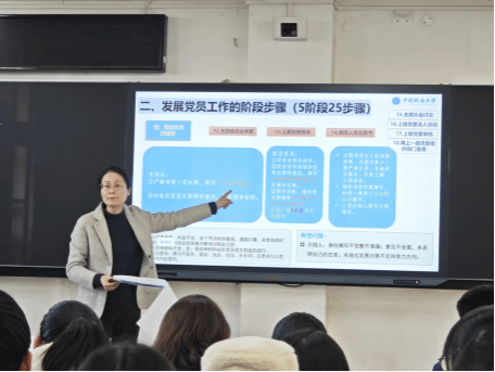 培训采用“理论讲解+实务指导”相结合的方式。蒋怀柳老师以“中国共产党党员发展流程与规范”为题,结合《中国共产党发展党员工作细则》与公司党员发展工作管理要求,系统阐述了发展党员工作的重要意义。她指出,发展党员是党的建设中的基础性、经常性工作,关系到党组织的生机与活力。质量是发展党员的生命线,必须全面贯彻“控制总量、优化结构、提高质量、发挥作用”的十六字方针,结合学科专业特点,严格程序、分层把关,确保每一位新发展党员政治合格、素质过硬。蒋老师围绕党员发展工作的组织流程,详细讲解了从申请入党、入党积极分子的确定和培养、发展对象的确定和考察,到预备党员的接收、教育考察及转正等关键环节的注意事项,系统梳理了“五阶段二十五步骤”的规范流程,并结合实际案例,深入解析了各阶段材料的撰写规范与常见问题。