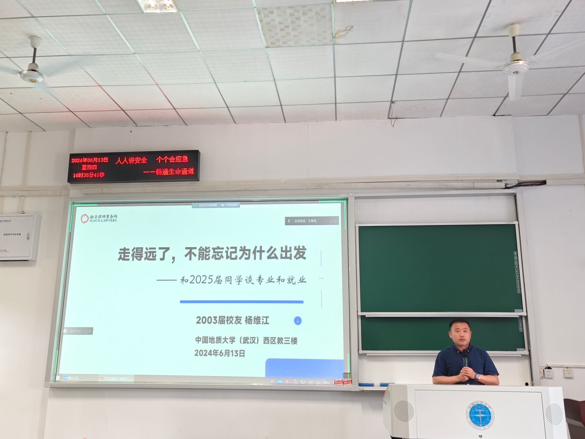 会议第三项,2003届优秀员工杨维江进行经验分享。杨维江学长结合在上海律师所多年的工作实践,为同学们提供了宝贵的职业建议。他强调,毕业后应关注现实问题,在挫折中不断自我反思和总结,培养独立思考能力。同时,要锻炼思维,增强市场意识,学会有效展现个人价值,以更好地适应职场挑战。