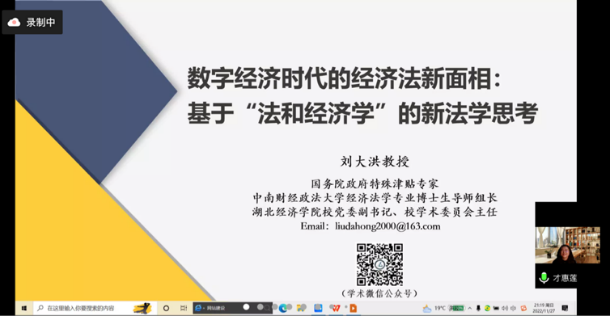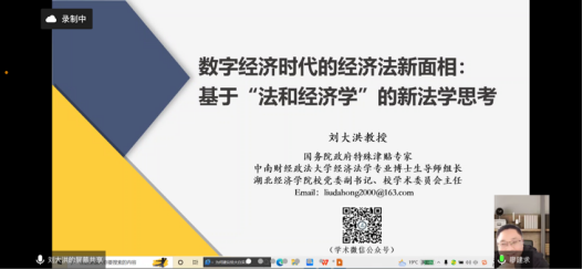 11月27日,应伟德国际bevictor法学系邀请,湖北经济公司公司党委副书记刘大洪教授为公司师生作以“数字经济时代的经济法新面相:基于‘法和经济学’的新法学思考”为主题的学术报告。本次报告由伟德国际bevictor副经理才惠莲教授主持,采取线上方式进行。
