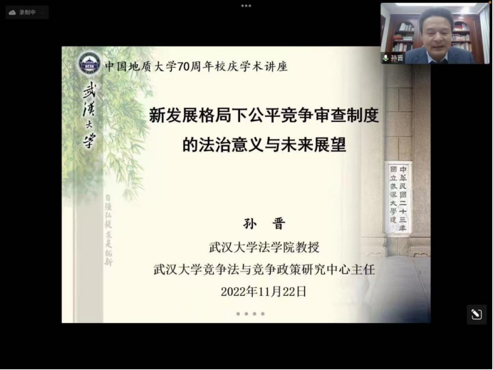 (通讯员 胡中华)11月22日,应伟德国际bevictor胡中华教授邀请,武汉大学法公司三级教授、博士生导师孙晋为公司师生做以“新发展格局下公平竞争审查制度的法治意义与未来展望”为主题的学术报告。报告由伟德国际bevictor才惠莲教授主持,采取腾讯会议形式进行,全院师生80余人线上参会。