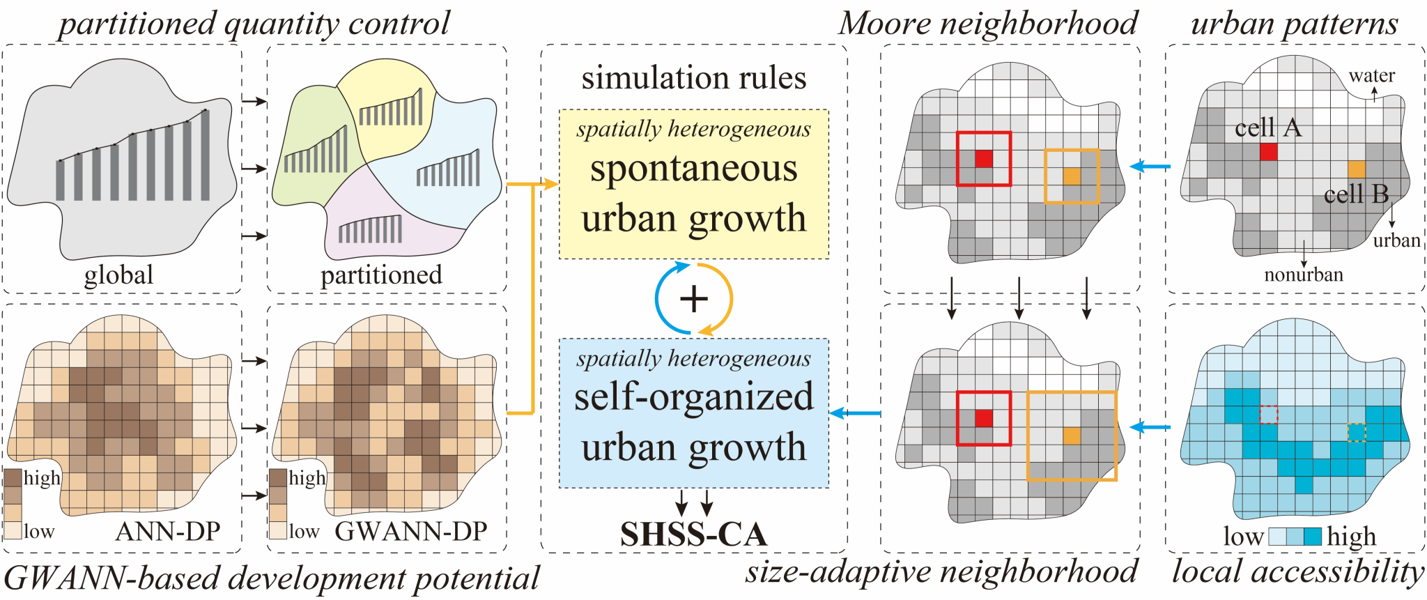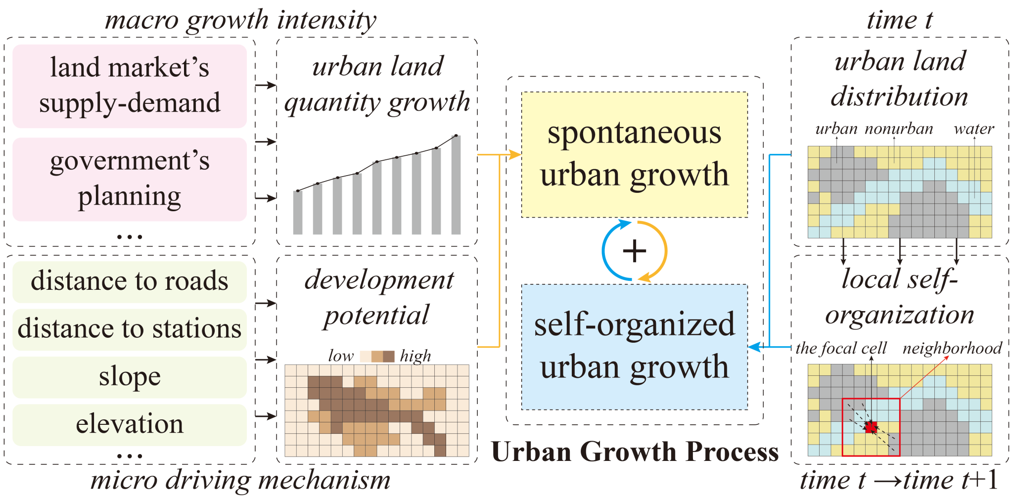 近期,1946伟德国际源自英国(武汉)胡守庚教授、张彬副教授等发表系列论文,提出了自然和自组织扩展过程耦合的城市空间扩展模拟方法,为精细化模拟城市空间扩展过程提供了新思路,能够有效支撑国土空间规划和城市更新等工作任务。