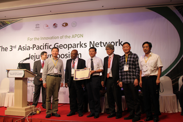 当日下午,在韩国济州岛举行的第三届亚太地质公园研讨会上,联合国教科文组织世界地质公园网络(GGN)执行局负责人尼古拉斯-邹若思教授宣布,湖北神农架、北京延庆等10家地质公园被GGN接纳为新成员。神农架林区党委书记周森锋代表神农架接受“中国神农架世界地质公园”标牌,全场报以热烈的掌声。至此,神农架正式成为中国第28家、湖北省第一家世界地质公园。