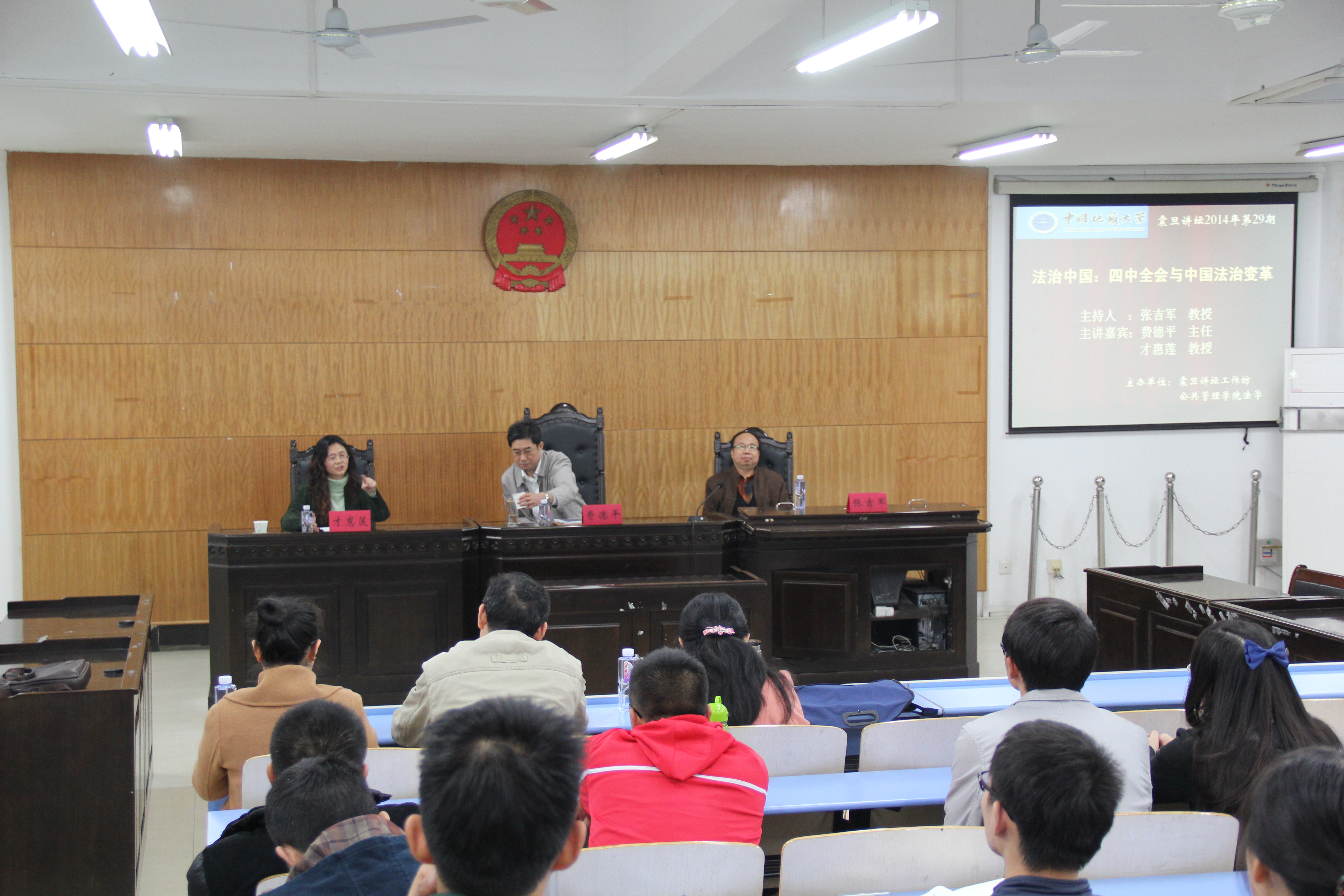 最后,才惠莲教授合公司的资源环境特色和法学教学实践,针对费德平的讲座内容作了精彩点评。现场教师和同学通过提问与回答的方式与费德平老师进行了精彩的互动。参加此次讲座的教师员工都表示此次讲座使他们受益良多,对四中全会的决定与法治变革有了更加全面深刻的认识。