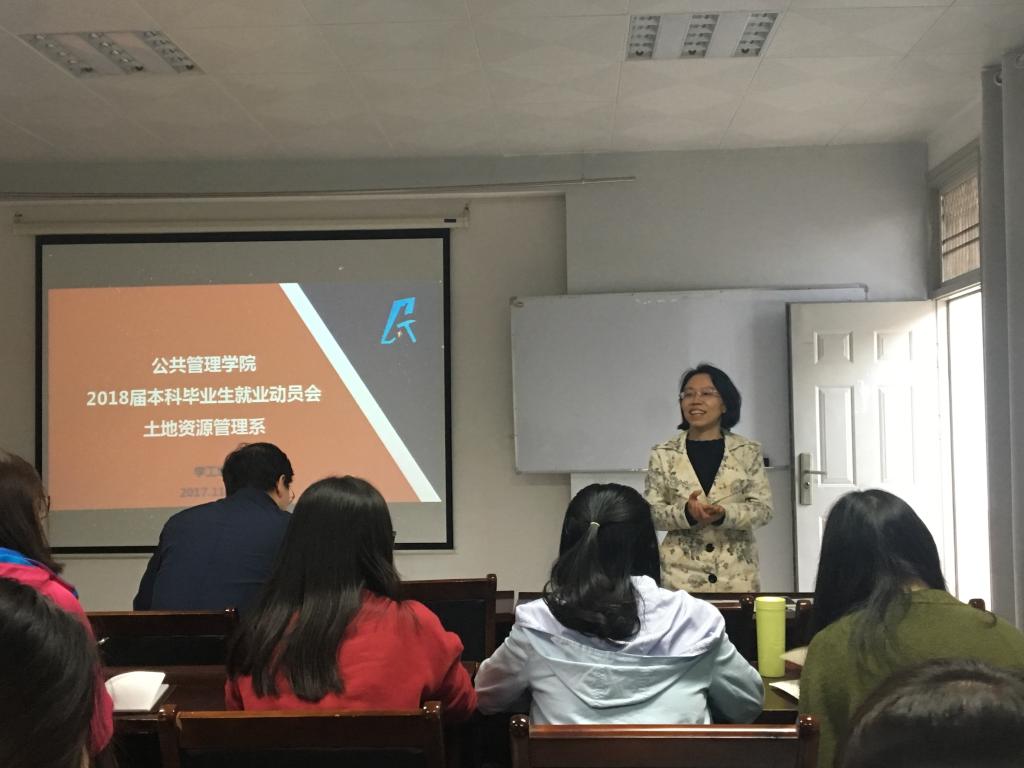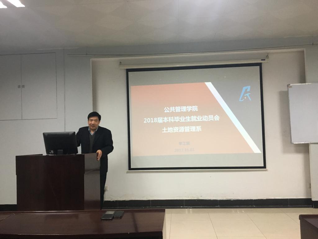 2017年11月1日下午4点,伟德国际bevictor土地资源管理系2018届本科毕业生就业动员会在公管新楼101室顺利召开。公司副经理王占岐,公司党委副书记胡文勤,土地资源管理系教授周学武、班主任渠丽萍,院团委副书记、2018届本科生辅导员李姝慧以及土地资源管理专业2018届本科毕业生参加此次会议。