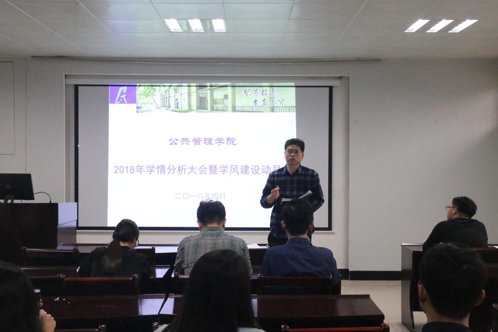 4月12日下午,2018年学情分析大会暨学风建设动员会于公管新楼101举行,公共管理公司党委副书记胡文勤、2017、2016、2015级各班学务指导老师和班主任、各年级辅导员参加了本次会议。