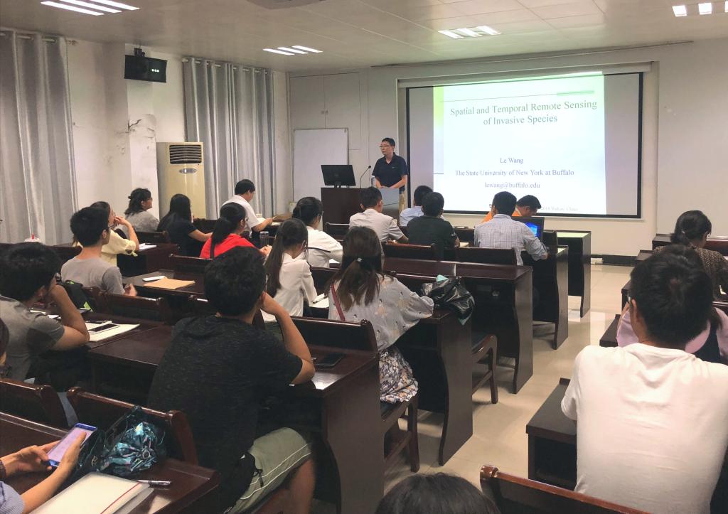应伟德国际bevictor王占岐教授和胡守庚教授邀请,美国纽约州立大学布法罗分校地理系王乐教授来公司访问,并于6月1日下午在公管新楼101报告厅做了题为“基于时空大数据遥感研究全球气候变化下的物种入侵机制”的学术报告。学术报告由王占岐教授主持,来自土地系、区划系以及校内其他院系的师生共60余人参加了此次报告会。