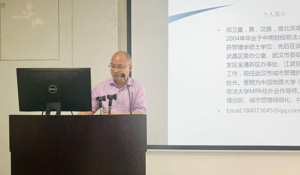 5月18日,武汉市城市管理局郑卫星处长作题为“快速城市化进程中的城市管理创新”的学术报告。郑处长介绍了城市化的概念,并以武汉市发展为例阐述了当前我国城市化进程,结合公共管理的理论就快速城市化背景下城市化管理中存在的重、难点问题进行了分析。郑处长以新常态下的城市管理创新结课,对当前和今后一段时间我国城市化创新管理提出了富有成效的方案。郑处长的学术报告内容丰富、语言风趣,与实际生活联系紧密。