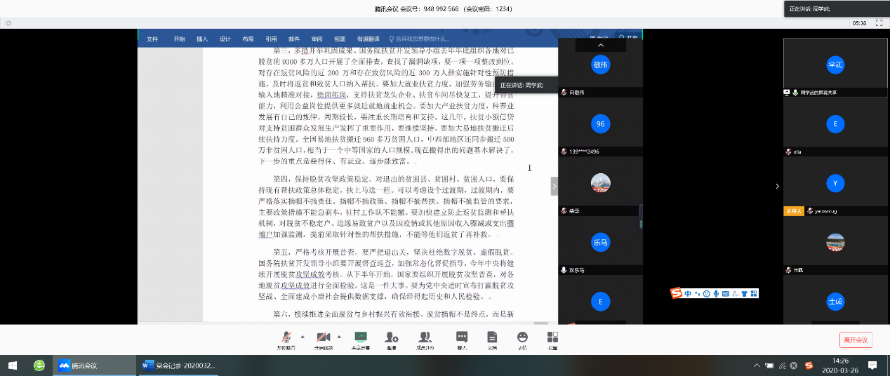2020年3月26日下午两点,土地系通过腾讯会议,开展了“坚持不懈坚决打赢疫情防控和扶贫攻坚阻击战”主题党日学习活动。在系支部书记周学武教授的带领下,各党员教师一起认真学习了各项内容,并展开了积极、热烈地讨论。