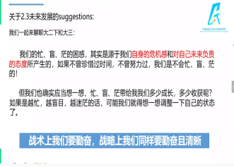 会议最后,刘书记以“坚守初心,砥砺致远”为主题,以学风建设为重点,向同学们提出了学业的要求和未来的期望。首先,刘书记通过对当前就业形势的分析,提醒同学们要努力学习、积极提升各项能力以适应新的成长发展环境。随后,刘书记分享了学风建设的视频,以标兵模范为指引带动同学们学习的积极性,并以“零存整取”、“碎片化学习”等学习方法为例,强调了找到适合自己的学习方法的重要性,为同学们的线上学习生活指点迷津。最后,刘书记将讲话内容总结提炼为“零存整取,同频共振;主责主业,自律自学;独立思考,切忌盲从;苦练内功,因势而新”八个层面分别进行了分析讲解,这八个层面的寄语内重思维态度、外看方法形势,为同学们开出了一剂高效学习、全面成长的良方。