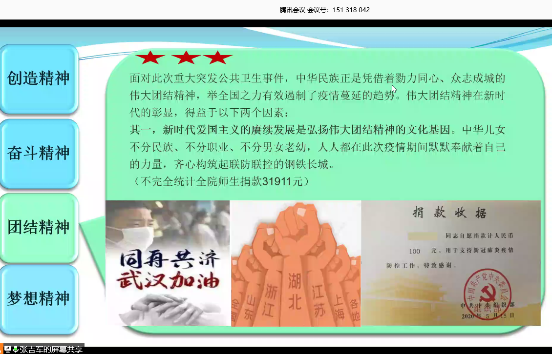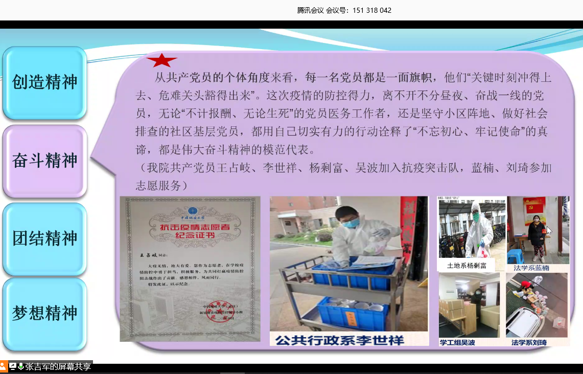 张吉军书记紧密围绕习近平总书记关于疫情防控重要讲话和指示批示精神,以《抗击新冠疫情彰显民族精神》为题,为全院教师党员讲授一堂专题“微党课”。他谈到,习近平总书记多次强调,实现中国梦必须弘扬中华民族精神。突如其来的新冠肺炎疫情,既是对我国治理体系和治理能力的一次大考,也是呼唤、锤炼和发扬中华民族精神的战场。在这场抗击疫情的人民战争中,我们发挥集中力量办大事的制度优势,全国上下迅速形成了抗击疫情的强大合力,充分展现了中国力量、中国效率、民族精神。他围绕“独辟蹊径勇于探索的伟大创造精神、自强不息只争朝夕的伟大奋斗精神、勠力同心众志成城的伟大团结精神、双战双赢命运与共的伟大梦想精神”四个方面的内容展开讲解。他谈到,从我们党执政的整体角度而言,作为中国特色社会主义事业的领导核心,中国共产党面对重大突发事件所展现的总揽全局、协调各方的强大动员能力、组织能力和执行能力,开创了一个又一个“中国奇迹”。从共产党员的个体角度来看,每一名党员都是一面旗帜,他们“关键时刻冲得上去、危难关头豁得出来”。这次疫情的防控得力,离不开不分昼夜、奋战一线的党员,无论“不计报酬、无论生死”的党员医务工作者,还是坚守小区阵地、做好社会排查的社区基层党员,都用自己切实有力的行动诠释了“不忘初心、牢记使命”的真谛,都是伟大奋斗精神的模范代表。他们“关键时刻冲得上去、危难关头豁得出来”。“人无精神则不立,国无精神则不强。”中华民族在庚子年初彰显的“抗疫精神”,是伟大民族精神的时代剪影和集中升华,是疫情防控阻击战取得重大战略成果的“精神武器”。在实现“两个一百年”奋斗目标的历史交汇之年,我们更加需要强化中华民族精神的“硬核”力量,提升中华民族的战斗力,激励中华儿女乘风破浪、一往无前,朝着中华民族伟大复兴奋勇前进。张吉军书记要求全公司党员师生围绕“微党课”的学习,进一步深入交流研讨,碰撞思想火花,总结“抗疫”经验,发扬“抗疫”精神,发挥党员先锋作用,共同谱写公司改革发展的新篇章。