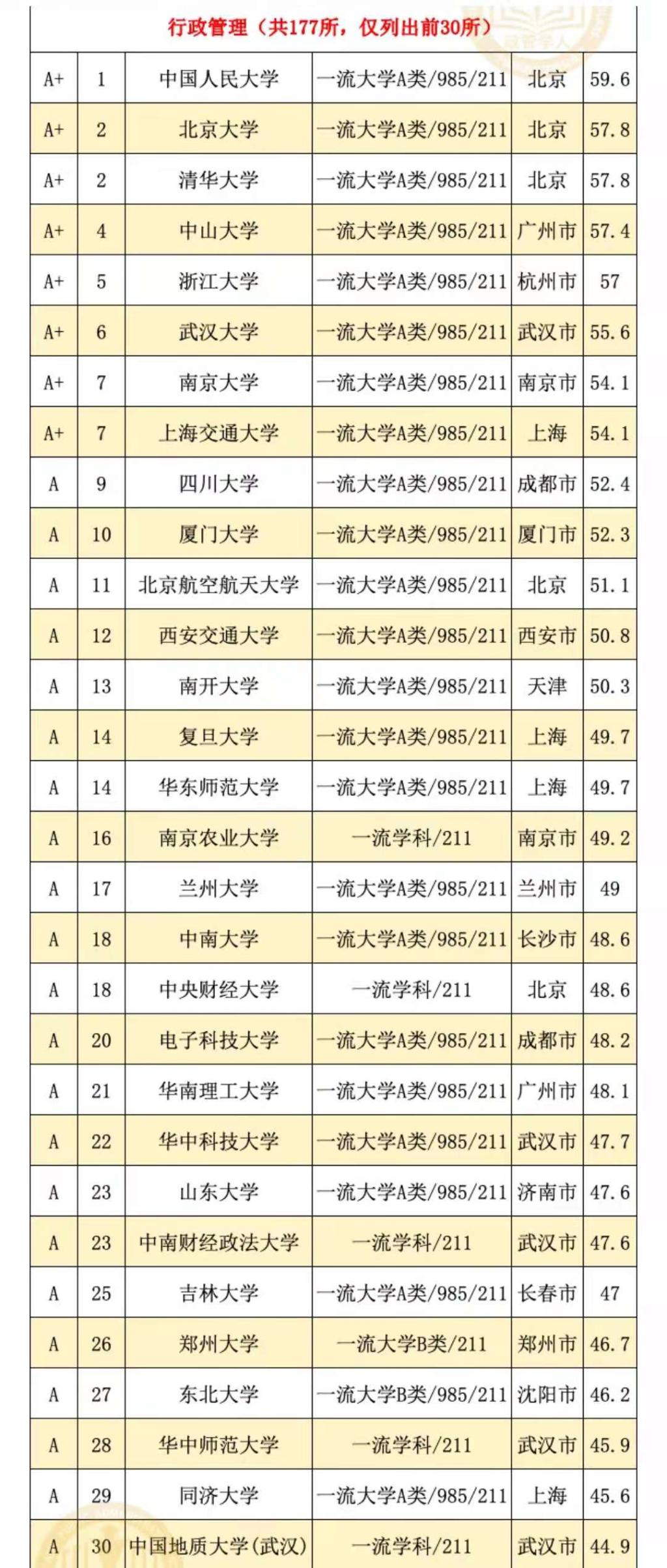 公司公共事业管理专业居全国前14%(29/206),行政管理专业居全国前17%(30/175),皆入选国家级A类专业,其中行政管理已入选国家一流本科专业。