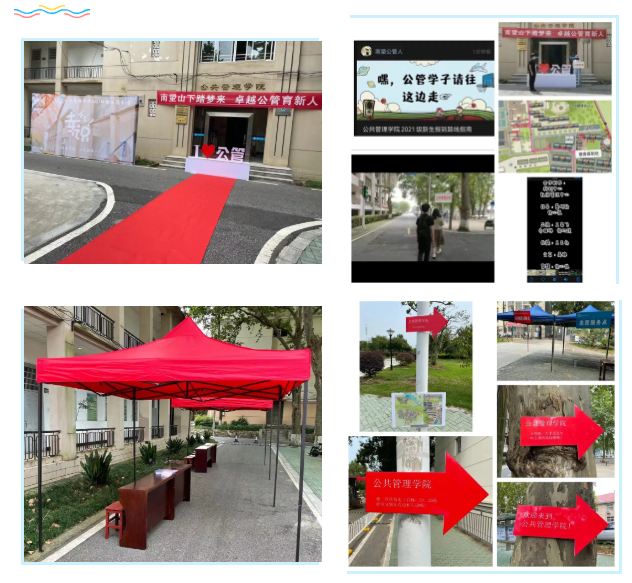 ·学工组老师与员工会同学一起在公管楼前铺设红地毯,布置新生签名墙,悬挂迎新横幅,设置路标,筹备布置迎新点的各项工作。