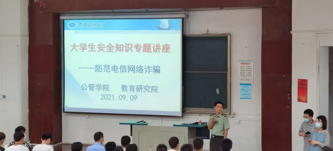 2021年9月9日上午,老员工安全知识专题讲座在教一楼一阶教室顺利举行。本次讲座特别邀请了喻家山派出所二级警官王东、安全保卫部副部长彭冠军和治安一科科长田汉幸、科员张伟。公司党委副书记刘国华、团委副书记李姝慧、研究生辅导员王青涛,21级全体本科生和21级部分研究生同学参加了本次讲座。