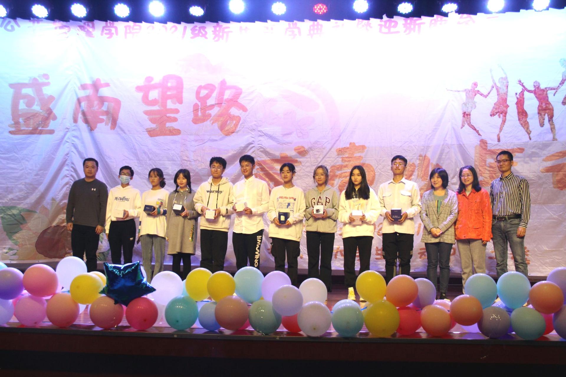 班级节目评分颁奖环节,由主持人宣读本次晚会一二三等奖的获奖班级,171211班获得最佳人气奖,171211班、17G211班、175212班分别获得一、二、三等奖。王青涛老师、刘国华副书记分别上台颁奖并与获奖班级同学代表合影留念。