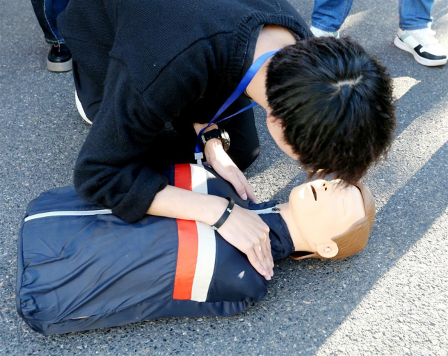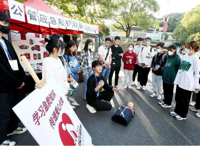 10月20 日,伟德国际bevictor员工在示范科普应急救护技能。面对常态化疫情防控,该校伟德国际bevictor在全国高校率先设立建设应急管理专业,开设应急救护课程,提高员工应急救护处理突发事件能力,更好服务社会大众。(湖北日报全媒记者 张鸿 通讯员 屠傲凌 摄 )