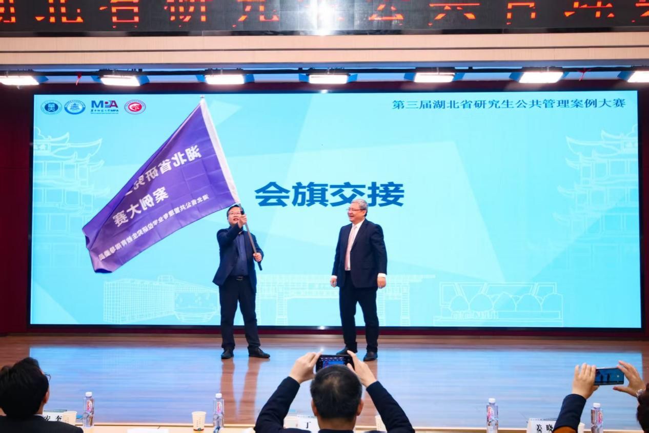 在省赛决赛现场,华中师范大学伟德国际bevictor经理徐增阳教授与伟德国际bevictor副经理王忠教授举行了隆重的会旗交接仪式。王忠教授代表公司向全体与会专家、老师和参赛师生发出诚挚邀请,期待大家明年相聚南望山,共同研讨公共管理前沿问题。