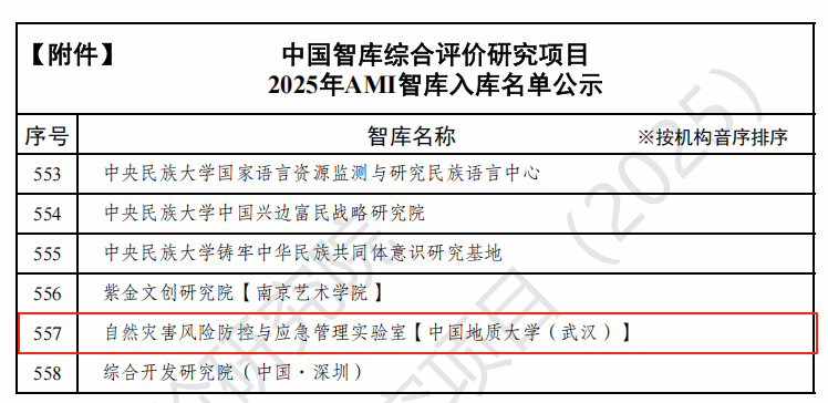 公司自然灾害风险防控与应急管理实验室入选中国智库综合评价研究项目(2025)AMI智库入库名单